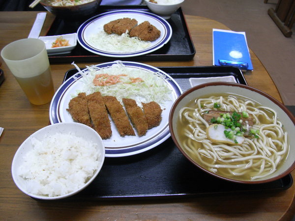 我姊跟老闆的:炸豬排+高麗菜絲+白飯+醃漬物+沖繩麵